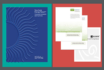 Embossed, die-cut, pocket-folder containing reference materials for The New York Energy Smart Transformer Initiative; Informational and reference book designs for PINJ/Professional Impact New Jersey and GLSEN/Gay, Lesbian and Straight Education Network.
